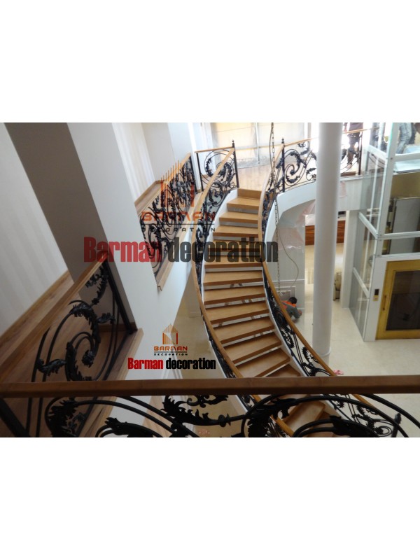 پله اجرا شده یکی از خاصترین نرده فرفورژه های موجود در بازار میباشد این پروژه مربوط به پاسداران میباشد با کف پله چوب بلوط