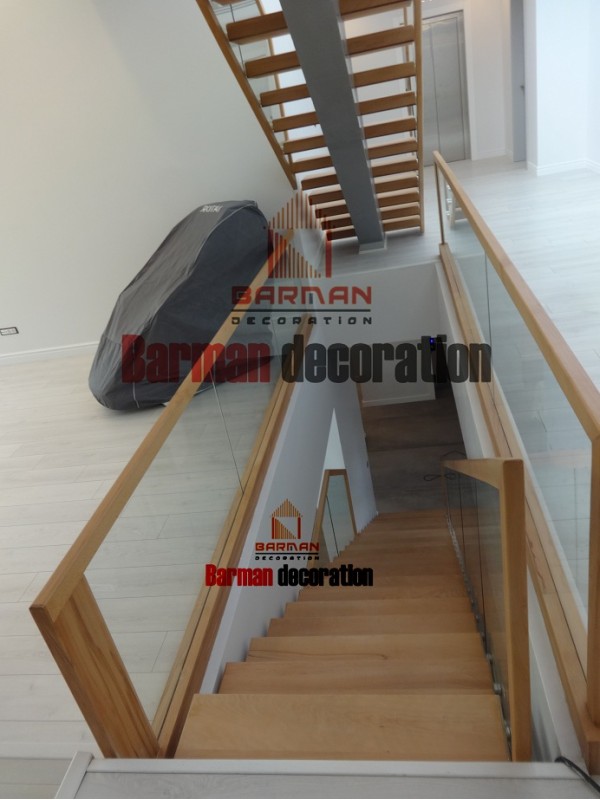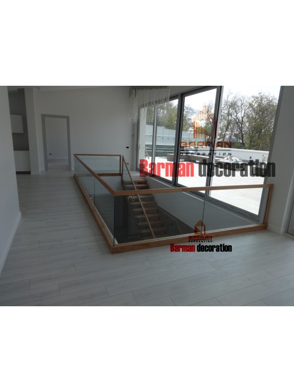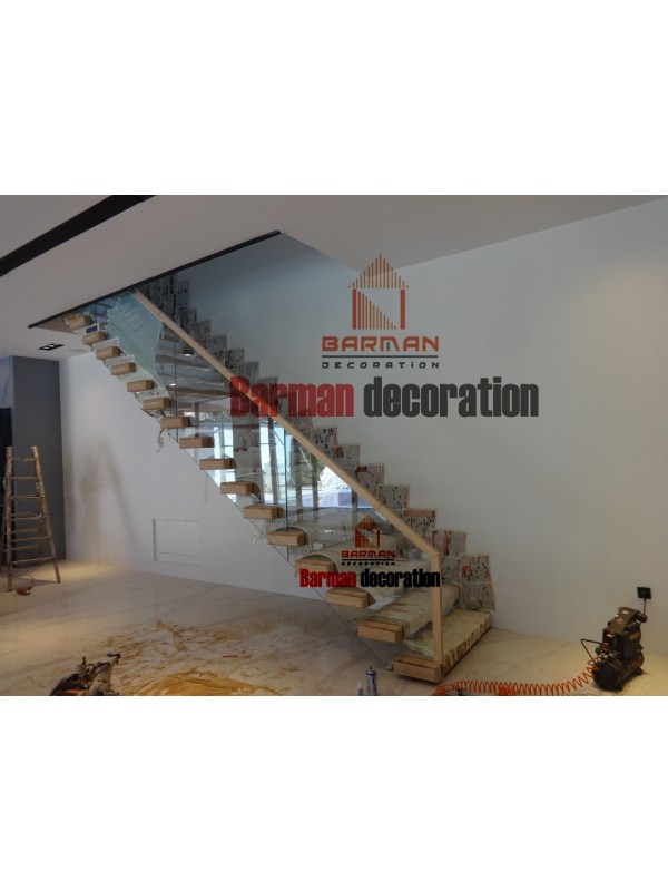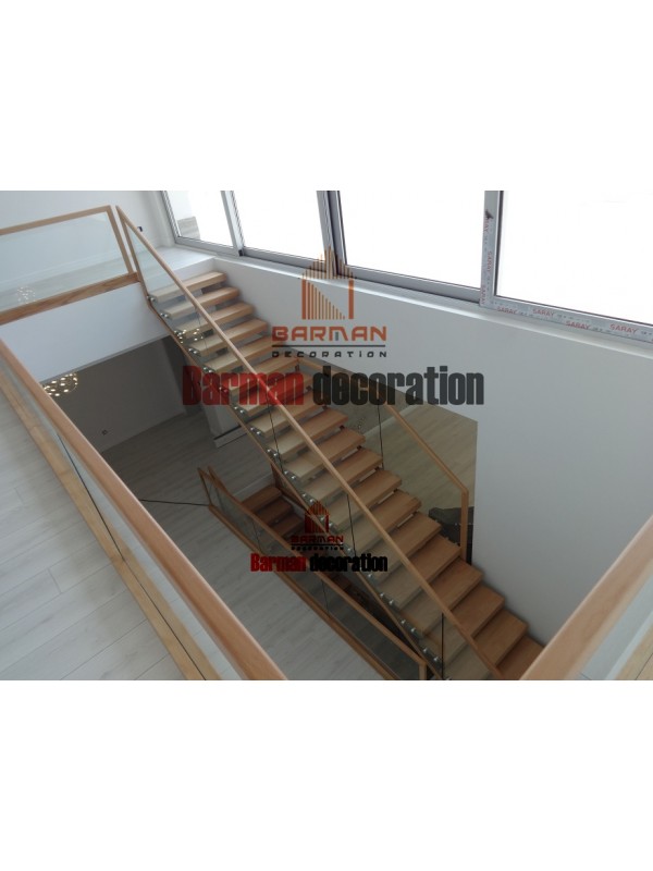 پله گرد - پله پیچ دو محورباکس با کف پله چوب و نرده شیشه و شاسی چوبی هندریل چوبی پله دکوراتیو پله دوبلکس